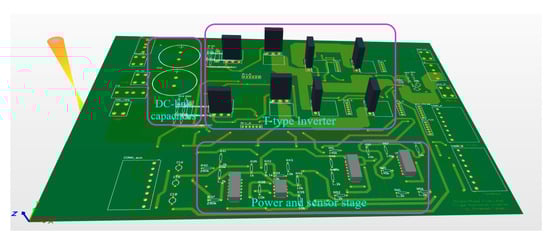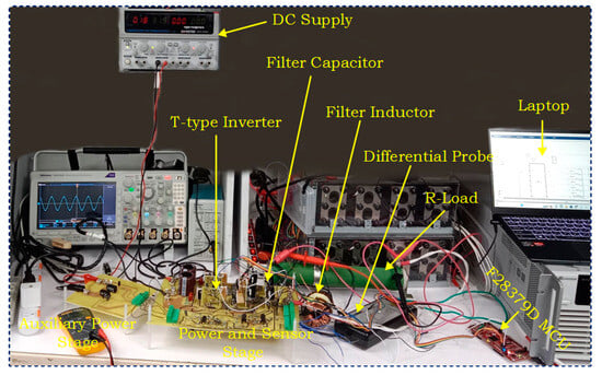 All the above-mentioned components were deployed and fabricated on a PCB for designing the T-type inverter. Figure 15 demonstrates the layout of the power and converter stage on a two-layer PCB. The architecture diagram of the overall T-type inverter is displayed in Figure 16. Hardware implementation of the prototype of the single-phase five-level T-type inverter has been developed in the laboratory to validate the FCS-MPC technique. The components mentioned earlier are arranged according to the circuit shown in the layout. The developed hardware prototype was used in this experiment and is displayed in Figure 17. C2000-F28379D DSP generates the controlling pulses for the gate of MOSFETs. These pulses control the switching time of the MOSFETs by regulating the pulse width of the signal. These controlling pulses have been generated using the FCS-MPC strategy. A load is connected at the output terminal to perform the testing and to evaluate the effectiveness of the control strategy used in this paper. A digital storage oscilloscope is used for measuring the output voltage and current. The specification of the experimental setup is mentioned in Table 4.