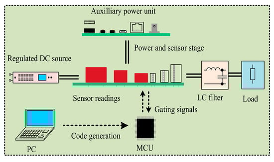 - Current and Voltage Sensors: The converter needs two current sensors to measure the filter and load current, as well as three voltage sensors for the measurement of filter, load, and capacitor voltages. The current sensors are designed using the ACS712 hall-effect current sensor IC. The filter capacitor for the current sense is chosen as 100 nF. For the voltage sensor, non-inverting operational amplifiers (OP-AMPs) are employed to provide step-down gain, offset and isolation. It has three stages namely, the gain stage, the positive offset stage, and the isolation stage. General-purpose Op-Amps are used for designing the voltage sensors which are powered by a ±15 V supply. The gain stage steps the high voltage to a range between 0–1.65 V. The offset stage adds a positive bias such that the reading is positive for even the negative values for measured voltage. The final isolation stage facilitates galvanic isolation between the MCU ground and the measurement ground through an isolation amplifier. Thus, a value from −300 V to +300 V is scaled to 0 to 3.3 V for data acquisition by the MCU;