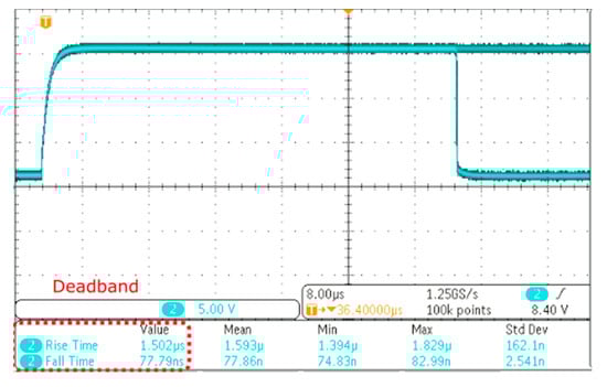 The parameters used during the prototype testing are mentioned in Table 5. These parameters have been used in the hardware development as shown in Figure 17. As mentioned earlier, a specific configuration has been used in the gate driver unit to provide the hardware deadband, and the generated deadband is shown in Figure 18. The rise time of the gate signal is 1.502 µs, while the fall time is 77.79 ns. This will prevent the overlap as the first switch will be already turned off well in advance of the other switch’s turn-on transition.
