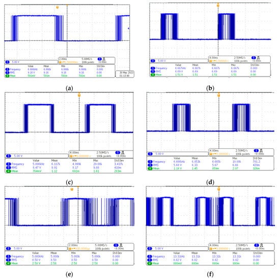 Switching signals to all the switches: (a) S1 gating; (b) S2 gating; (c) S3 gating; (d) S4 gating; (e) S5 gating; (f) S6 gating.