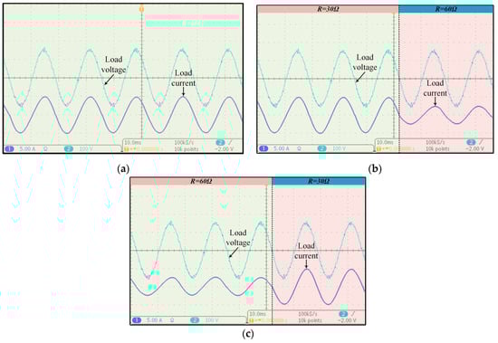 The inverter was tested under three different loading conditions: uniform load, dynamic loading with load changing from R/2 to R, dynamic loading with load changing from half to full load, and dynamic loading with load changing from R to R/2. The effect of load variation on the output load voltage has been illustrated in Figure 22. It is apparent from the figure that load voltage is unaffected by the load change and maintained at the same voltage level. The result outcomes are summarized in Table 6. Thus, a stabilized output voltage can be maintained at the load terminal by implementing the control strategy used in this paper.
