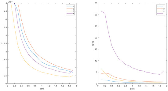 Given , we set with to construct a consistent matrix equation. First, we test the impact of in the ME-RBK method on the experimental results. Figure 1 plots the IT and CPU versus different “para” with different matrices in Table 3, where 0.1:0.1:1.9 so that satisfies in Theorem 1. From Figure 1, it can be seen that the number of iteration steps and the running time decrease with the increase in parameters. However, when , both IT and CPU begin to increase. The same situations occur when solving consistent or inconsistent equations with different matrices in Table 4 and Table 5. Therefore, we set in all experiments.
