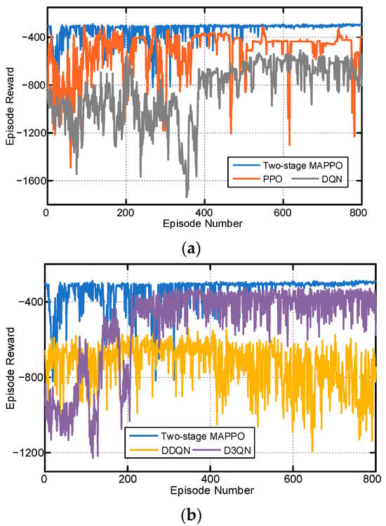 We compared our two-stage MAPPO method with the non-dominated sorting genetic algorithm III (NSGA-III) algorithm [41] and PSO algorithm [42], which are commonly used for microgrid optimization scheduling. It is worth noting that NSGA-III algorithm is typical of evolutionary algorithms and the PSO algorithm is typical of swarm intelligence algorithms. We applied these three methods to four different microgrid scenarios and observed the rewards obtained by the microgrid environment model. The results are shown in Figure 22.