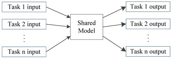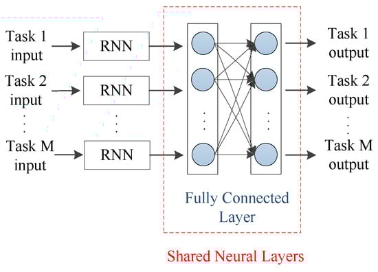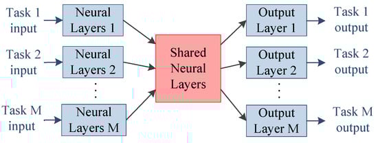 In order to process the tasks jointly, neural-based models provide an efficient way to combine the representation of multiple tasks that makes it attractive, ranging from computer vision [44,45] to natural language processing [46,47]. We show the architecture of multi-task learning in Figure 1. First, each task is input into a shared model that consists of neural layers. Such shared layers are used to extract common feature representations. Then, the remaining networks are split into multiple branches to capture individual feature representations for each particular task [48,49].