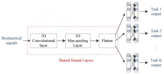 We utilize 1D convolutional neural networks to capture the temporal features from bioelectrical signals. Specifically, as shown in Figure 4, the signal goes through a shared 1D convolutional neural layer and a shared 1D max-pooling layer. Then, a shared flattened layer converts the extracted feature tensor to a feature vector . For task i, it concatenates its private fully connected layer to the flattened layer to extract its interested features. After this, the task i utilizes another fully connected layer with sigmoid activation to determine whether the signal sequence belongs to its type.