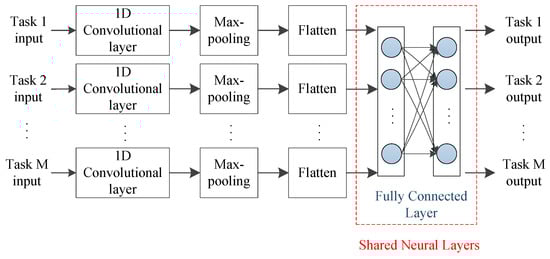 As depicted in Figure 7, the training dataset for each task i undergoes a series of transformations, beginning with a 1D convolutional neural layer and followed by a 1D max-pooling layer. Subsequently, a flattened layer is applied to convert the resulting feature tensor into a feature vector, represented by . By combining this feature vector with those from other tasks, we create a shared feature vector for all tasks, denoted by . Following this, the network incorporates several fully-connected layers, with parameters shared among all relevant tasks to connect to each task’s dedicated output layer.