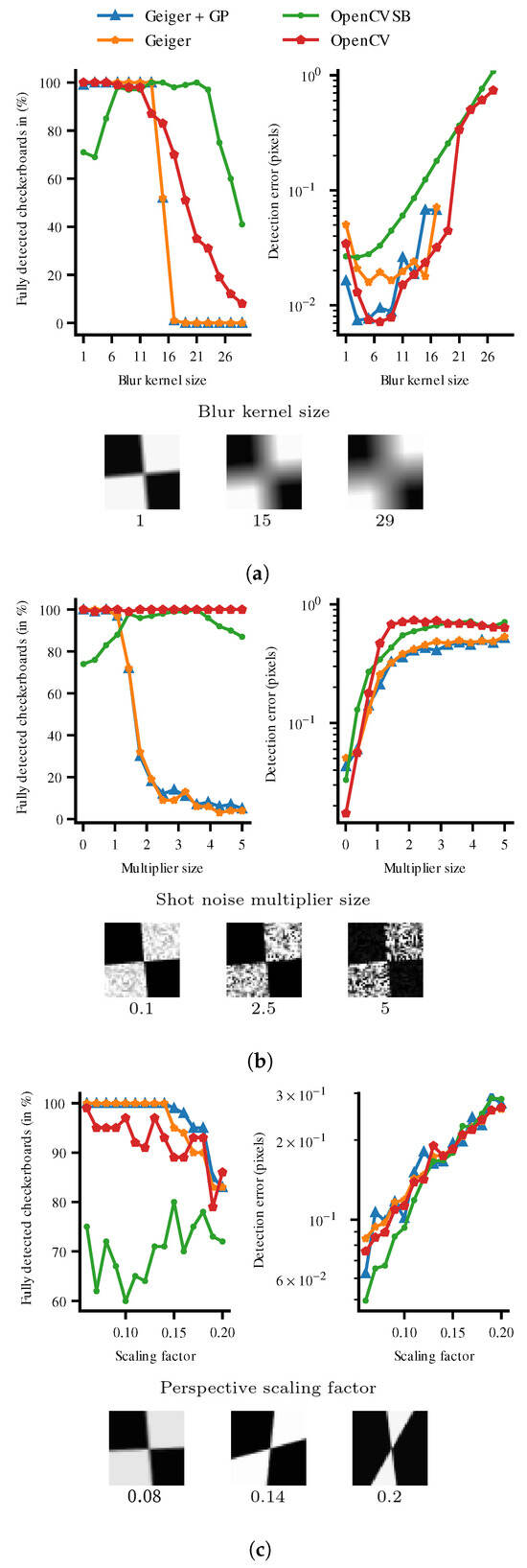 The Geiger detector, and by extension the proposed Geiger + GP method, fails to detect corners under a lower degree of blurring and shot noise compared to the OpenCV detectors, as can be seen in the left graphs in Figure 4a,b. The right graphs in Figure 4a,b show that the GP corner refinement is able to reduce the corner position error when blur and shot noise is introduced into the images. The Geiger method is able to detect more corners under higher degrees of perspective transformation compared to the OpenCV methods, and the GP enhancement is able to improve this further for higher degrees of perspective scaling. The OpenCV SB method performs notably worse for all degrees of perspective transformation. This is shown in the left graph of Figure 4c.