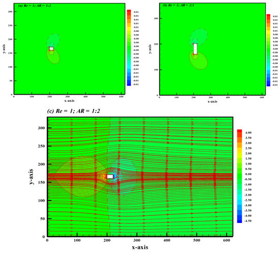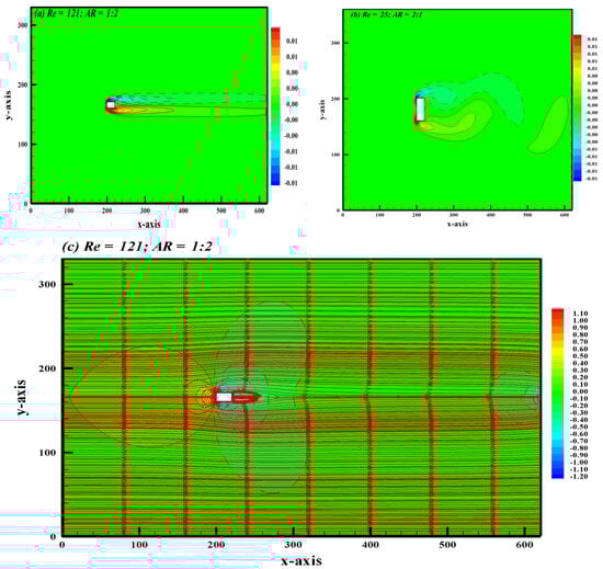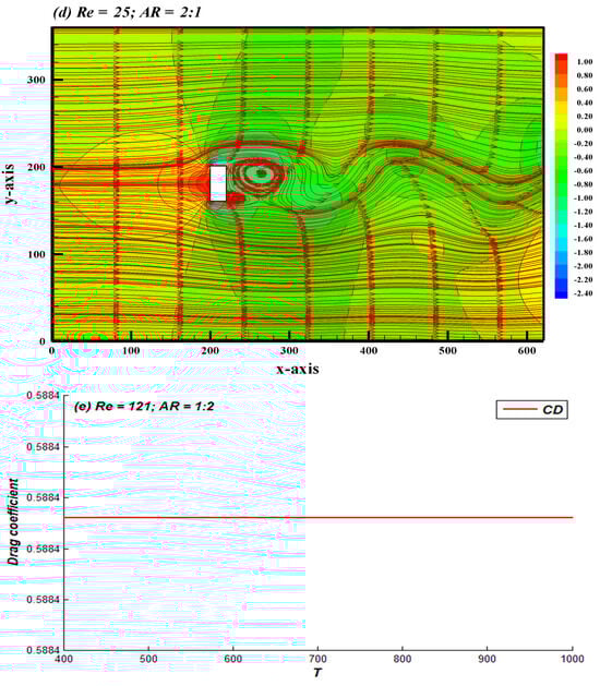 Table 3 describes the complete picture of the Reynolds number range for all three flow regimes (steady, transient, and unsteady) observed in this study corresponding to both AR cases. It is evident from this table that for AR = 1:2, the flow exhibits steady behavior (Regime I) from Re = 1 to 120. This implies that the flow remains relatively stable and predictable within this range of Re for AR = 1:2. On the other hand, when AR = 2:1, the steady flow regime spans the Re range from 1 to 24, which is a comparatively low range of Re when compared to the AR = 1:2 case. This is similar to the cases of flow Regimes II and III as well and suggests that an AR = 1:2 is more suitable for stabilizing the incoming fluid than an AR = 2:1. In the case of AR = 2:1, the unsteadiness in flow starts much earlier due to its vertical placement. It resists large amounts of incoming fluid, and due to its shorter width, it is unable to stabilize the shear layers. Guo et al. [36] also categorized the flow around a square cylinder into three phases. According to them, in phase I, no vortex shedding appeared and lift remained zero; in phase II, vortex shedding and lift oscillations started and enhanced with Re; and in phase III, stable vortex shedding occurred. According to other studies, the flow around a square cylinder remains steady in the range from Re = 1 to 47, is transient in the range of Re = 48 to 53, and becomes completely unsteady beyond this value of Re [10,37]. According to Kelkar and Patankar [9], the onset of vortex shedding around a square cylinder starts at Re = 53. This shows that the change in AR has a significant effect on the flow mode transitions around sharp-edged bodies. These findings are also consistent with those of Rastan et al. [38]. According to these authors, the critical Re for the onset of vortex shedding is lower in cases of vertical flat plates than in square cylinders.
