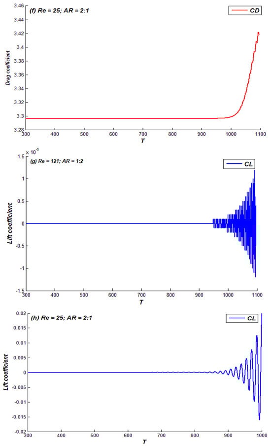 Previous studies have highlighted how changing these parameters can lead to different flow regimes, with a significant impact on fluid forces, vortex shedding, and flow structures [1,2,3,4,5,6,7,8,9,10]. Hamane et al. [1] investigated the vorticity structures in a circular cylinder’s wake at different Reynolds numbers of 20, 40, 100, and 3000 using the lattice Boltzmann method (LBM). They observed the steady-state flow at Re = 20 and 40, while at a Re of 100, vortex shedding appeared. Due to the vortex shedding, the drag and lift became periodic, with the frequency of drag being double that of the lift force (). They attributed the lift variations to vortex shedding instead of pressure variations, which mainly affect the drag force ().