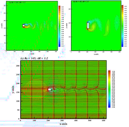 - Ahmed, S.; Islam, S.; Nazeer, G.; Zhou, C.Y. Numerical Investigation of Strouhal number discontinuity and flow characteristics around single rectangular cylinder at low aspect ratios and Reynolds numbers. J. Braz. Soc. Mech. Sci. Eng. 2021, 43, 1–26. [Google Scholar] [CrossRef]