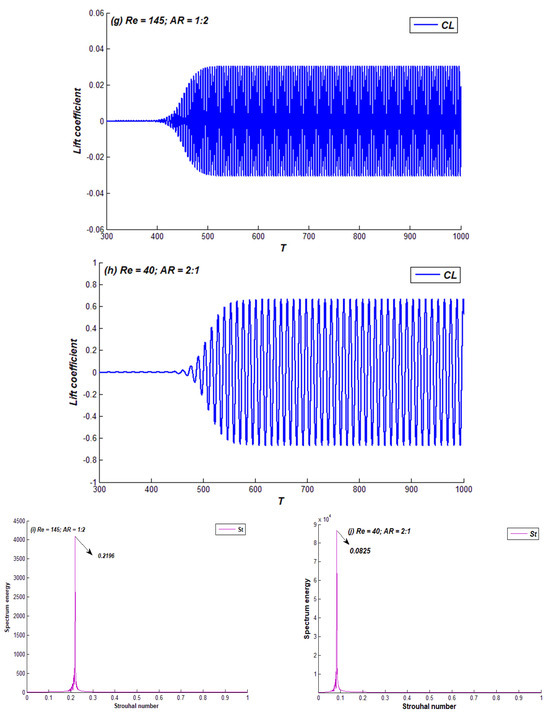 When the Re of flow reaches a value of 145 for the cylinder with an AR = 1:2 and Re = 40 for the AR = 2:1 case, the transient state of flow changes to a completely unsteady state. This flow state is named Regime III in the current study. In this regime, the fully developed flow layers detaching from cylinders result in the complete generation of vortices moving alternately in the wake of cylinders. The corresponding vorticity contour, pressure streamlines, CD, CL, power spectrum of CL, and phase diagram for Regime III are revealed in Figure 5. From Figure 5a,b, it is evident that the fully developed vortices exhibit alternate movement, commonly termed the von Karmann vortex street. The curvature of cross-flow rotations is higher in the case of AR = 2:1 as compared to AR = 1:2. Note that in the initial stages of Regime III, comparatively weaker vortices appear in the wake. With the increment in Re values, the relative strength of the vortices increases, which results in an increase in the amplitudes of flow-induced forces. Figure 5c,d demonstrate that the streamlines corresponding to the flow show curvy behavior due to vorticity generation in the wake. For the case with AR = 1:2, the symmetric bubbles that appeared in the wake of the cylinder for the Regime II case no longer exist due to unsteadiness in the flow. Instead, recirculating elliptic or vertically mounted airfoil shapes such as eddies appear in the near wake region of the cylinder. The structures of these eddies are different in both AR cases. The streamlines’ contours also indicate that AR = 2:1 causes more disturbance in the surrounding fluid flow in comparison to the 1:2 case. Due to this disturbance, for the AR = 2:1 case, the amplitudes of flow-induced drag as well as lift coefficients become sufficiently higher as compared to the 1:2 aspect ratio case (Figure 5e–h). Both these force coefficients start periodic behavior at earlier stages as compared to Regime II. The higher amplitude of CL curves results in a smaller vortex shedding frequency (St = 0.0825), while the low-amplitude cycles result in higher shedding frequencies (St = 0.2196), as indicated by the power spectrum of CL for AR = 1:2 and 2:1, respectively (Figure 5i,j). Further, these figures also indicate that the vertically mounted cylinder (AR = 2:1) has higher spectrum energy, while the horizontally placed cylinder (AR = 1:2) has low spectrum energy. The phase diagrams shown in Figure 5k,l illustrate the periodic flow that results in the cyclic variations of both CD and CL in both AR cases.