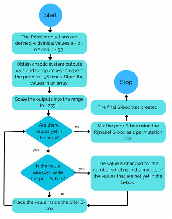 The algorithm developed for creating an S-box using the dynamic behavior of the Rössler equations is shown in Figure 2. The initial steps focus on generating pseudo-random numbers, which are instrumental in defining the 256 values of the S-box. Subsequently, the final step involves introducing a layer of complexity by applying a transformation inspired by the Rijndael S-box to the generated numbers.