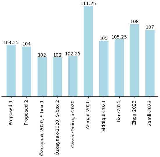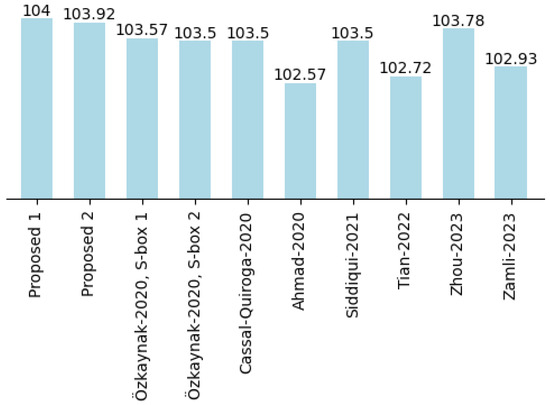 The non-linearity scores for proposed S-boxes 1 and 2 are introduced in Table 3; for S-box 1, the minimum NL = 98, maximum NL = 106, average NL = 104.25, and for S-box 2, the minimum NL = 100, maximum NL = 106, average NL = 104 is achieved. High non-linearity measures ensure the ability of resisting attacks, such as linear cryptanalysis; also, Figure 3 demonstrates that the criterion is consistent with other S-boxes developed with chaos. For symmetric Boolean functions, the maximum non-linearity achieved is 112, and nonlinear values above 98 are considered good [20].