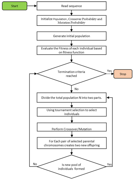 GA is an evolutionary method that imitates the “survival of the fittest” strategy. GA uses a stochastic process that considers a set of probable ways to solve a problem. In this case, each solution represents a chromosome, and the chromosome set is termed a population. To determine the quality of the solution, objective functions or fitness functions are associated with each chromosome. Based on the fitness function, the chromosomes that best fit the generation will be selected using the selection operation. After that, other genetic operations, such as mutation and crossover, are carried out on the mainly chosen chromosomes to change their fitness and produce a new generation. The operators, namely, the selection, crossover, and mutation processes, iteratively proceed until convergence to the best fitness value. All of these steps of the basic genetic algorithm can be found in reference [21]. The flowchart of the proposed GA-based model is illustrated in Figure 1.