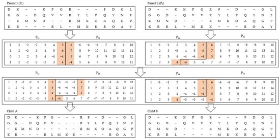 In the proposed method, alignments are coded as a matrix, where residues or amino acids are coded according to their positions in their respective sequences. At the same time, the gaps are represented by the last residue positions of their respective sequences but with a negative value. Essentially, the input alignments are coded before their processing. The entire optimization process is conducted by applying coded alignments. After finalizing the optimization process, individuals are decoded and consequently revert to their standard representations. Figure 2 illustrates an example of the suggested representation process. The main benefit of this representation strategy is that it allows for the simple identification of positions for crossover operation. Moreover, it can help to avoid mistakes that are likely to occur in the subsequent crossover operations, thereby ensuring better improvements in alignment management.