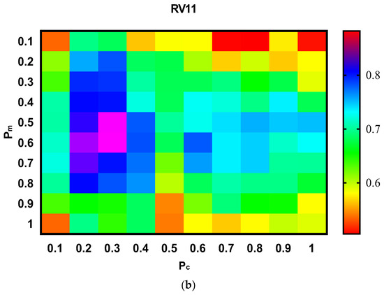 The selection operator is aimed at randomly identifying a pair of best chromosomes as parents ( and ) from the population generation of to take part in the crossover and mutation processes to generate offspring and for the new generation. The chromosomes with the best fitness scores are expected to be chosen for the next generation. In the suggested model, each chromosome is linked with two different functions, and , as shown in Equations (1) and (2). However, selecting one chromosome with the best fitness scores for all of the functions is rarely possible. Thus, in the proposed approach, the entire population size is divided into two portions. Essentially, is used to obtain one portion of the population, while the is used for the other portions. In this way, the selection operation proceeds along with mutation and crossover until the next generation is obtained. Several selection methods can be used [54,55] to select the best individuals. Mainly, in this work, the tournament selection approach with a tournament size of 2 is employed [54], which can consider the different selection pressures without any alterations. In this selection process, two randomly selected individuals compete in the tournament. The fittest among the two is chosen as a parent and takes part in the crossover operation.