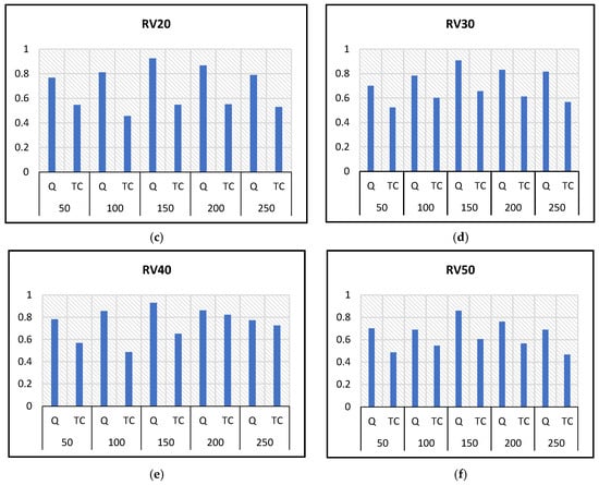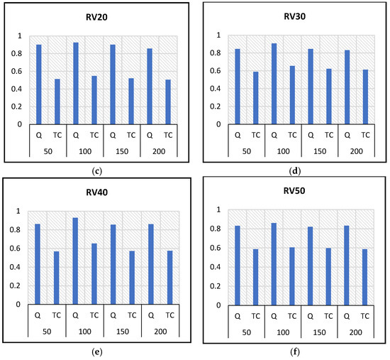 To investigate the impact of the population size , different values of the N parameter were experimented with, which include [50, 100, 150, 200, and 250] with already chosen ( and ) crossover and mutation probability values. From the results in Figure 6a–f, it can be seen that all other values used in the setting do not show a significant improvement between 100 and 150. This means that the model started to improve when the N values reached a value of 150 in most cases. However, increasing the value of N could increase the complexity of the training, including the computation time. The ideal value of the population size for the model configuration was selected as 150.