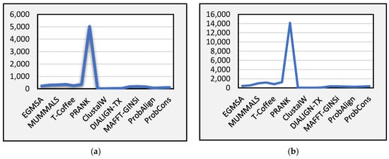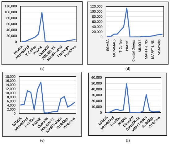 Figure 8 presents the total runtime required by the different comparison methods and our proposed method for the six subsets in BAliBASE v3.0. As can be seen, the runtime required by our proposed model is reasonable. In general, there is a trade-off between the alignment quality performance and computation time across all of the BAliBASE datasets, as can be noted in the existing literature [46]. Figure 8a–f depict the runtime for the proposed model alongside the baseline methods.