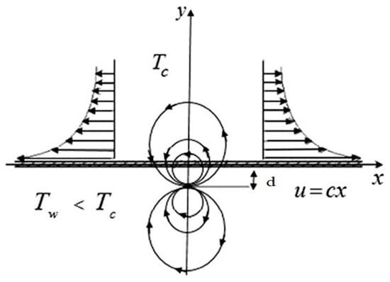 - Andersson, H.I.; Valnes, O.A. Flow of a heated ferrofluid over a stretching sheet in the presence of a magnetic dipole. Acta Mech. 1998, 128, 39–47. [Google Scholar] [CrossRef]