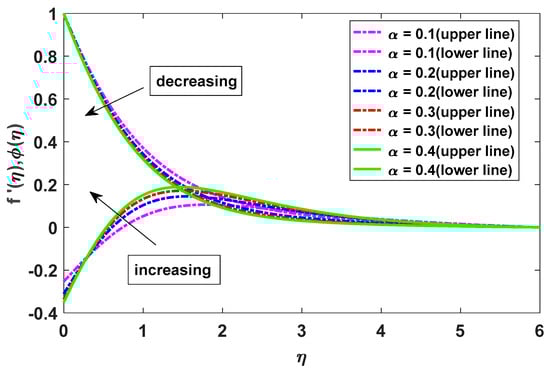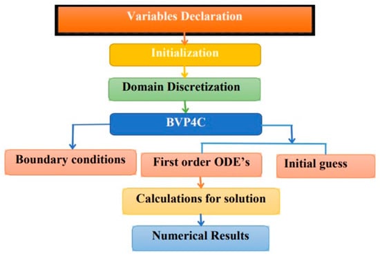 Numerical methods are employed to handle the boundary constraints, represented by Equations (19) and (20), within the dimensionless flow system described by Equations (16)–(18). Due to the inherent nonlinear nature of the equations, exact solutions are extremely challenging to obtain. Therefore, we have opted to utilize a well-established numerical approach, the BVP4C method, within the MATLAB 2020b computational environment. To apply the BVP4C method, the higher-order boundary value problem must be transformed into a 1st-order initial value problem. The numerical process is outlined in Figure 2, and a high degree of accuracy, up to six decimal places, is achieved by configuring the convergence criteria with a relative error tolerance of 10−6. Various initial estimates for the values of f″(0), θ′(0), and ϕ′(0) are utilized to obtain solutions that ensure that the velocity, temperature, and concentration profiles asymptotically satisfy the far-field boundary conditions. Adjusting the boundary layer thickness, which is influenced by the parameter values, is crucial for this purpose. To ensure the validity of the numerical calculations, it is imperative that all profiles asymptotically satisfy the infinite boundary conditions. Additionally, the obtained results are compared with the findings of other researchers whose work has been previously published.