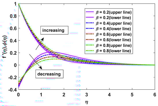 The velocity and concentration profiles are shown in Figure 3. As β increases, the ferrohydrodynamic interaction makes the fluid more viscous, with higher adhesive forces, resulting in increased velocity. The concentration profiles exhibit the opposite trend. Physically, this occurs when the ferromagnetic parameter in fluid motion increases due to the rise of the momentum boundary layer.