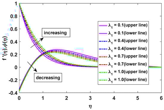 The effects of the ferromagnetic parameter on the local Nusselt number are depicted in Figure 11a. When the ferromagnetic parameter increases, the heat transfer rate declines, decreasing the heat transfer rate from the surface. Figure 11b demonstrates the variations in the local Sherwood numbers with varying thermophoresis parameters. And since the Sherwood number is indirectly proportional to the thermophoresis parameter, alternatively, it decreases, as verified by Figure 11, which depicts the flow pattern as streamlines for β.