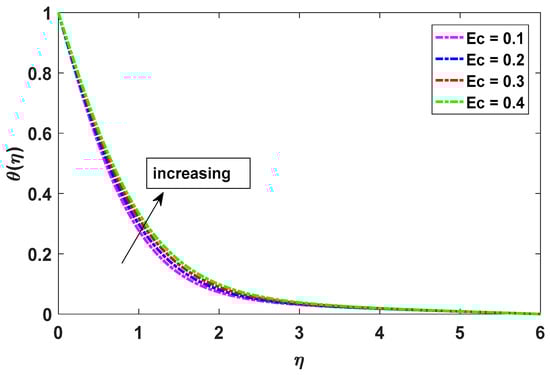 Figure 4 illustrates the effects of α on the velocity and concentration profiles. Higher α values reduce the velocity, while the concentration profiles show the opposite behavior. Viscous forces diminish as the fluid moves away from the magnetic dipole. Figure 5 shows the impact of λ1 on the velocity profiles. Increasing λ1 results in velocity profiles in opposite directions. The growth of the mixed convection parameter leads to faster velocity as the buoyancy effects become more pronounced. A scatterplot in Figure 6 demonstrates how Ec affects the temperature distribution. As Ec increases, the temperature increases. This is due to the action of viscous heating.