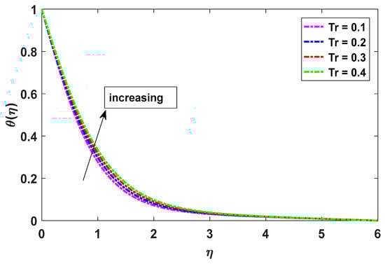 The influence of Tr on temperature is discussed using a scatterplot in Figure 7. When Tr increases, so does the temperature. When the boundary layer is thickened, the radiative forcing causes the temperature profiles to climb. Since all non-absolute-zero-temperature matter emits electromagnetic radiation in the form of thermal radiation, its purpose is to increase the medium’s thermal diffusivity, leading to more noticeable heat production in the boundary layer.