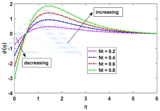 The consequences of the thermophoresis parameter Nt on the distribution of concentrations are shown in Figure 8. The concentration fields increase as Nt grows. Also, as Nt grows, the thermophoresis force rises, moving the nanoparticles from a warm region to a cold one; this, in turn, causes the concentration distributions to grow. Physically, thermophoretic force is to the result of a temperature differential that induces fast flow away from the wall, and it is well known that an elevation in the intensity of Brownian motion augments the thermal conductivity of the base fluid. As a result, the thermal boundary layer thickens as the hot fluid is channeled away from the wall.