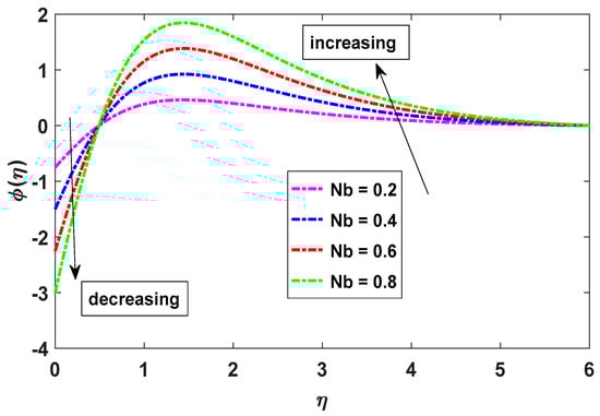 Figure 9 shows how the limit layer viscosity and concentration distribution grow with increasing Nb concentrations. As Nb increases, the liquid’s macroscopic particles become more likely to move randomly and collide with one another. As a result, there will be a higher concentration of liquid. By increasing Nb, the fluid velocity may be arbitrarily increased.