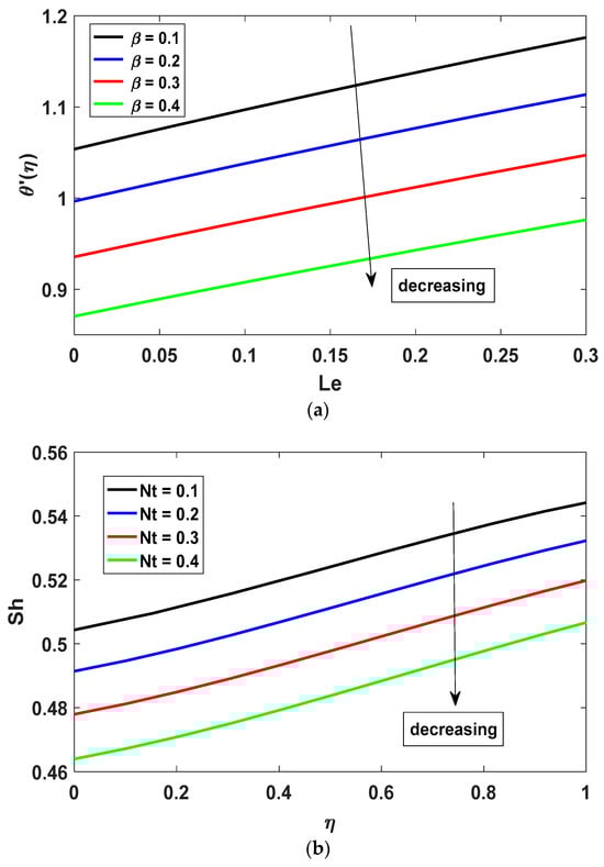 (a) Effect of β on Nu against Tr; (b) effect of Nt on Sh against η.