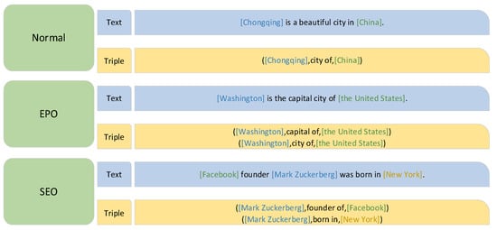Normal, entity pair overlap (EPO) triple, and single entity overlap (SEO) triple cases. In each example, overlapping entities are marked with the same color.