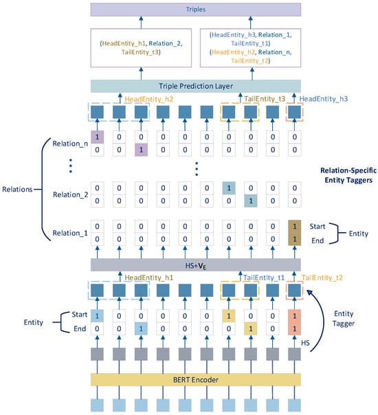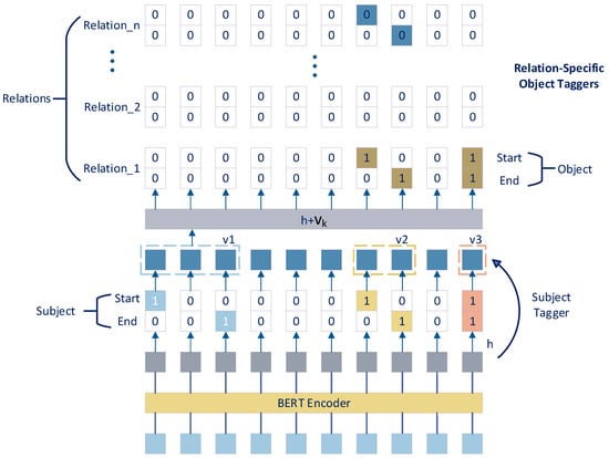 The goal of triple extraction is to identify all possible triples (head entity, relation, tail entity) in a sentence, which may contain some overlapping and shared entities. The structure of the CasRel framework is shown in Figure 2. The CasRel framework presents a fresh perspective on the task of triple extraction. It introduces a novel cascade binary tagging framework, known as CasRel, that effectively addresses the complex challenge of managing overlapping relations by systematically establishing subject–object mappings within sentences [4]. This framework consists of a set of functions that identify entities and their related relations in an entity tagger and relation-specific object taggers. By employing the CasRel framework, the issue of sharing the same entity in multiple triples is addressed effectively, providing multiple related relations and corresponding entities for each entity. However, in the CasRel framework, if the subject tagger does not recognize an entity, the associated triad will be missed.
