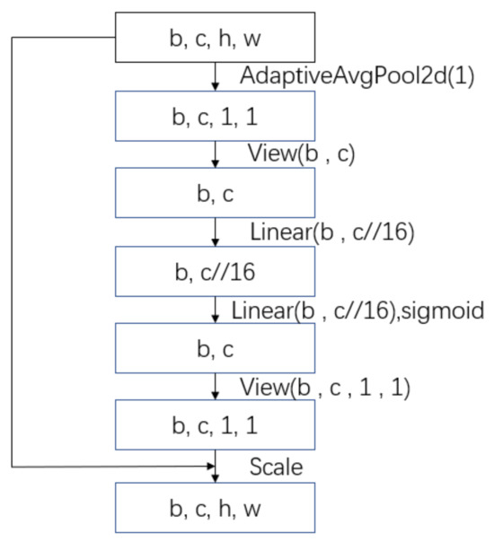 The SE block was divided into two steps: squeezing and excitation. Figure 4 shows a structural diagram of the SE block, where b, c, h, and w represent the batch size, channel, height, and weight of the feature map, respectively. During squeezing, the SE block reduces the dimensionality of the feature maps along each channel by performing global average pooling. Global average pooling computes the average value of the feature map of each channel, resulting in a single number per channel. This operation effectively compresses the channel-specific information into a single scalar. During excitation, the SE block employs a small neural network that typically comprises one or more fully connected convolutional layers. This network uses the squeezed information from the previous step and learns how to adjust the channel-wise weights. These learned weights are then used to reweigh the feature responses within each channel. Essentially, the excitation operation assigns importance scores to each channel, enhancing the responses of the more important channels and suppressing those of the less important ones.
