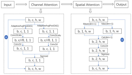 The CBAM attention module consists of two components: the channel and spatial attention module. The channel attention module primarily focuses on the interchannel relationships within the feature maps. It dynamically adjusts the contributions of each channel by learning their respective weights, thereby highlighting the channels most relevant to the current task. Conversely, the spatial attention module focuses on the relationships between different spatial positions within the feature maps. It dynamically adjusts the feature responses at each position by learning spatial position-specific weights, thereby emphasizing the spatial regions relevant to the task at hand. The CBAM attention module simultaneously considers both channel and spatial relationships, thereby enabling a more comprehensive capture of critical information within the feature maps. Compared with the attention mechanism of SEnet, which focuses only on the channel, CBAM can achieve more optimized results. Figure 6 shows a structural diagram of the CBAM block.