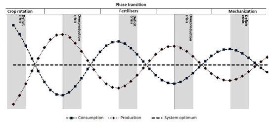 Such a system is adaptive. The adaptivity of the system in this respect is aimed at correcting the internal energy imbalance and achieving the state of optimum entropy. The system can be considered in terms of two counterpolar factors. The amplitude ratio and frequency response of such a system will then depend solely on the initial store of energy and the interference degree of the counterpolar parameters. Figure 1 shows an example of such a system in dynamics that are based on a case of agricultural production.