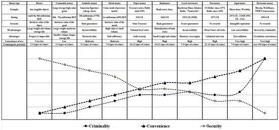 The above graph shows the criteria of the monetary system, such as the security, convenience, and criminality of money over the last three thousand years; these criteria are expressed on the normalized, ranking and evaluative scale that was designed by the authors based on historical data. As such, the convenience of use was evaluated in terms of the protective and accumulative properties of money. Criminality was assessed by the number of economic crimes that are possible with this type of money, and it was reflected in the remaining legislative sources. The security of money was estimated as a factor of guaranteed liquidity, and this was determined with regard to the source of guarantee and its possibilities.