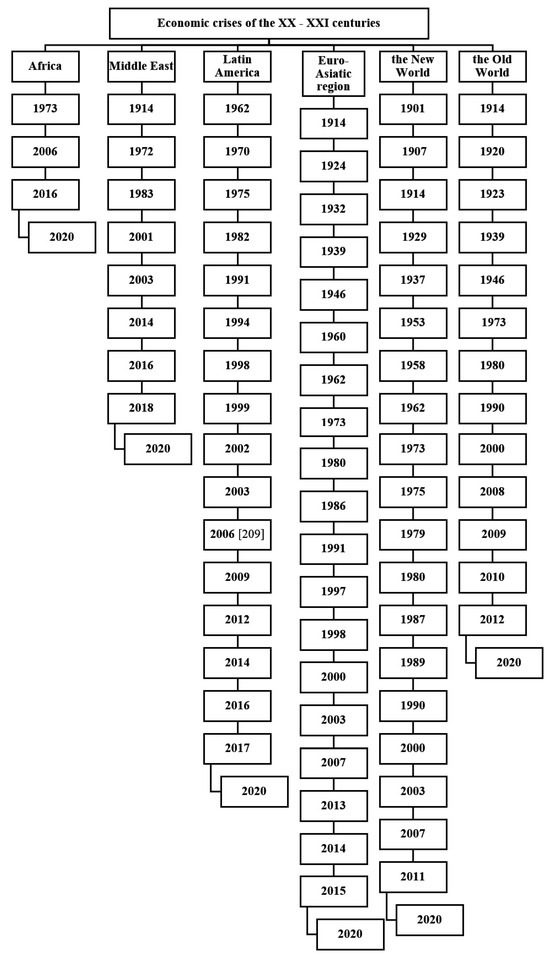 Over the years, a great deal of scientific effort has been dedicated to researching economic crises. There are many contributions that are worth mentioning: Karl Marx [1] asserted the inevitability of crises; John Maynard Keynes [2] believed that an economy without crises was possible; Israel Krizner [3] criticized the models suggested by the above authors; Paul Krugman [4] came up with a model that was accepted as conventional; Albert Aftalion [5] considered crises a periodic phenomena; Nikolai Kondratieff [6] discovered the periodicity of crises; Wesley Clair Mitchell [7] examined the nature of economic cycles; Murray Rothbard [8] investigated historical and economic aspects of the Great Depression; and Hernando De Soto [9] revealed the economic nature of social crises.