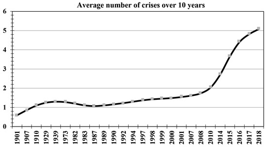 Starting from the middle of the last century, intensification processes have occurred in the economy. These process have entailed the development of data transmission facilities, an increase in transmission speed, as well as the enhancement of frequency and the velocity of transactions, thus leading to an overall economic advancement that has been achieved to the point of its overheating. Figure 3 and Figure 4 show summary diagrams of the economic crises that we know about from over the past 800 years.