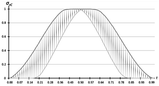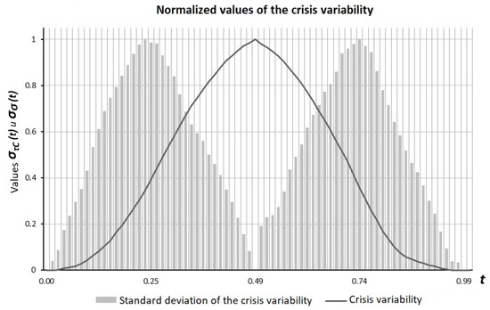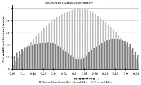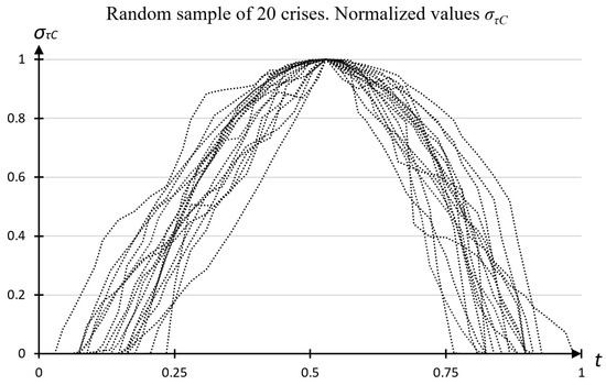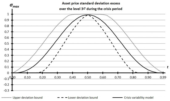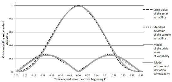 According to this model (Figure 7), for the values that are normalized by and which are in the crisis period normalized by its duration t, there is an excess of the short-term standard deviation of the asset above the level . This corresponds to Formula (10):