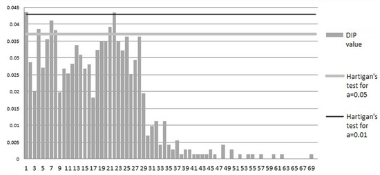 - Hartigan, J.A.; Hartigan, P.M. The Dip Test of Unimodality. Ann. Stat. 1985, 13, 70–84. [Google Scholar] [CrossRef]