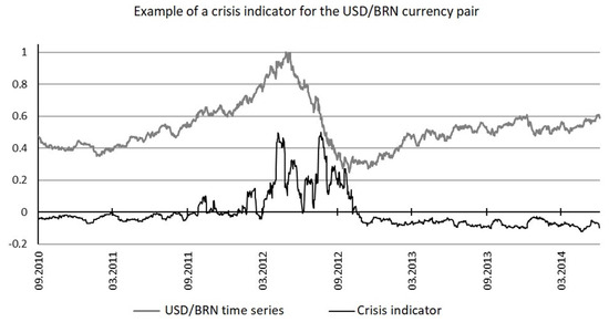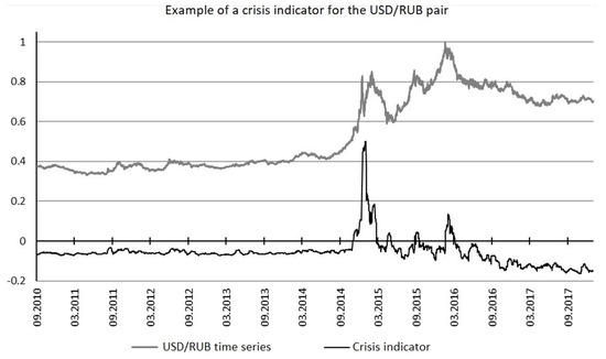 To apply as an indication of the presence of a crisis, we used the Heaviside function with a simultaneous reduction in to the interval that has a zero boundary corresponding to , as is shown in the Formula (5):