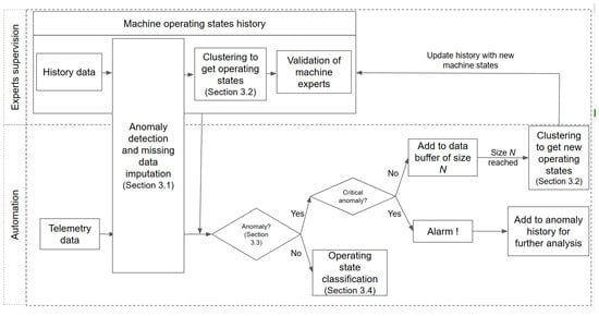 - The second part, “real-time exploitation”, or “Automation level”, is almost entirely automated. Telemetry data come from sensors, PLC, etc. The imputation module (“Anomaly Detection and Missing Data”) fills in missing data if necessary. Then, based on historical data, if the telemetry data have abnormal behavior (“Anomaly detection” module, Section 3.3), the procedure classifies it as a candidate for new operating states or triggers an alarm depending on the severity. These anomalies will be added to anomaly history for further analysis. On the other hand, if the telemetry data have normal behavior, the classification module will tag it into one of the historical operating states. Because the real-word dataset has unbalanced class problems, the module “Operating state classification” (Section 3.4) consists of ensemble learning classifiers to enhance the accuracy of the classification.