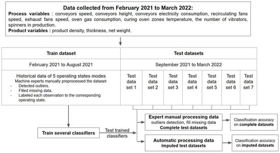 This learning phase starts with a set of historical machine operating data, which typically contains data quality issues including outliers, redundant data, and missing data. The “Anomaly Detection and Missing Data” module (Section 3.1) aims to address these significant data quality issues. Subsequently, the module “Clustering to get Operating States” (Section 3.2) handles the preprocessed dataset to identify the machine’s operational states. These proposed operational states are then subject to review, adjustment, and validation by machine experts to establish the final machine operating states. These labeled operating states serve as the reference points for classifying new observations during the real-time exploitation phase.