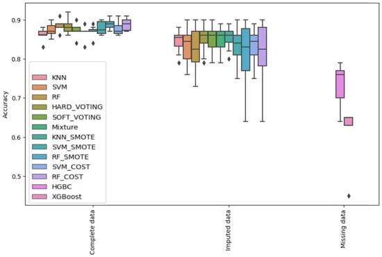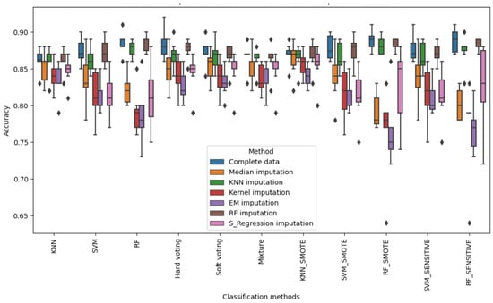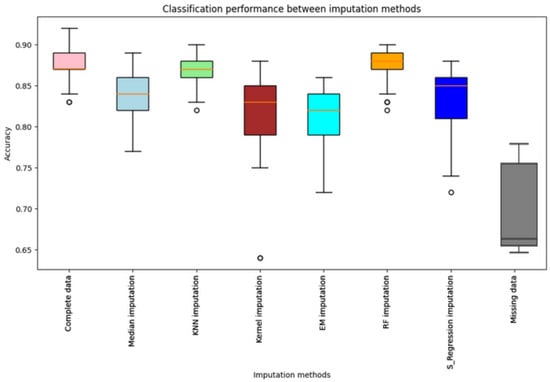 Various studies have highlighted that a substantial amount of missing data within a dataset can negatively impact the performances of classification models, potentially leading to misleading results []. The literature offers a range of techniques for addressing missing values, from basic methods like removing observations with missing values to more advanced imputation techniques such as the K-nearest neighbor algorithm []. Assessing how imputation methods influence subsequent classification models developed using imputed data is crucial. In the context of classification, a limited number of studies have compared the performance of different imputation methods [,]. Recently, authors in [,] assessed incomplete datasets’ effect on classification models’ performance. They found that the ratio, missing data size, and dataset balance are the most significant factors. Another alternative method for handling missing data is “mean/median imputation” ([]). If an item or items of the same variable are missing, each missing case will be replaced with the mean/median value of other completed items from that variable. However, this method usually underestimates standard errors when the proportion of missing data increases. Apart from “mean/median imputation”, several imputation methods have been proposed to handle missing data. Some frequently used methods are addressed, such as the following: