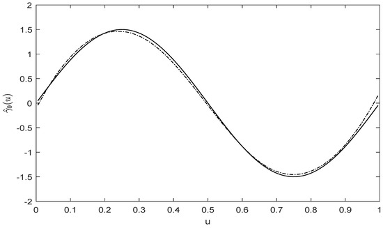 Throughout the simulation, we use the centered cubic B-splines as the basis functions. The smoothing parameter K is selected using the generalized cross-validation (GCV) criterion. Similar to [28], we focus on the spatial scenario with a total of R districts, where in each district, there are l members with each neighbor of a member giving equal weight such that , where is an l-dimensional column vector with all elements being 1 and ⊗ is the Kronecker product. In our simulation, the sample sizes are set to be and 6, where and 50, and 8. For comparison, three different values, , 0.5, and 0.8, are also considered, where represents weak spatial dependence, represents mild spatial dependence, and represents strong spatial dependence.