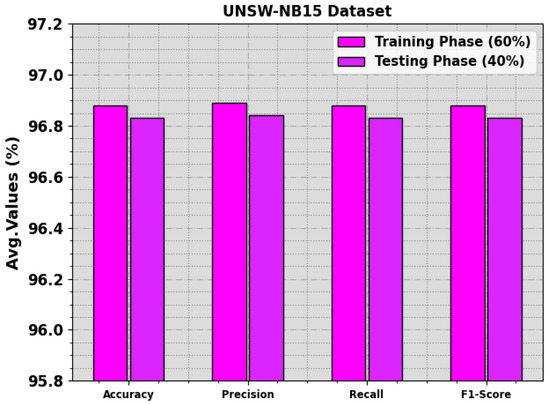 Table 2 and Figure 4 highlight the recognition outcomes of the NIDS-LOFSDL system upon the UNSW-NB15 database. The outcomes indicate the proficient recognition of normal and attack instances. With the 60% TR set, the NIDS-LOFSDL technique achieved an average of 96.88%, a of 96.89%, a of 96.88%, and an of 96.88%. Additionally, with the 40% TS set, the NIDS-LOFSDL algorithm attained an average of 96.83%, a of 96.84%, a of 96.83% and an of 96.83%.