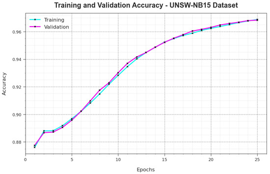 Figure 5 illustrates the training accuracy values, i.e., and , attained by the NIDS-LOFSDL technique on the UNSW-NB15 dataset. is determined by evaluating the NIDS-LOFSDL method on the TR dataset, whereas the value is computed by evaluating the outcomes on a separate testing dataset. The results imply that both the and values increased with an upsurge in the number of epochs. Accordingly, the performance of the NIDS-LOFSDL system is confirmed to achieve the maximum performance on both TR and TS datasets, with an increase in the number of epochs.