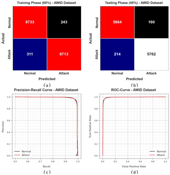 AWID dataset: (a,b) Confusion matrices, (c) PR_curve, and (d) ROC.