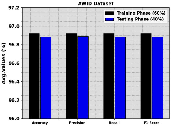 Table 3 and Figure 8 demonstrate the recognition outcomes of the NIDS-LOFSDL methodology on the AWID database. The simulation value refers to the proficient recognition of both normal and attack samples. With the 60% TR set, the NIDS-LOFSDL system attained an average of 96.92%, of 96.92%, of 96.92%, and an of 96.92%. Then, with the 40% TS set, the NIDS-LOFSDL methodology accomplished an average of 96.88%, of 96.89%, of 96.88%, and an of 96.88%.